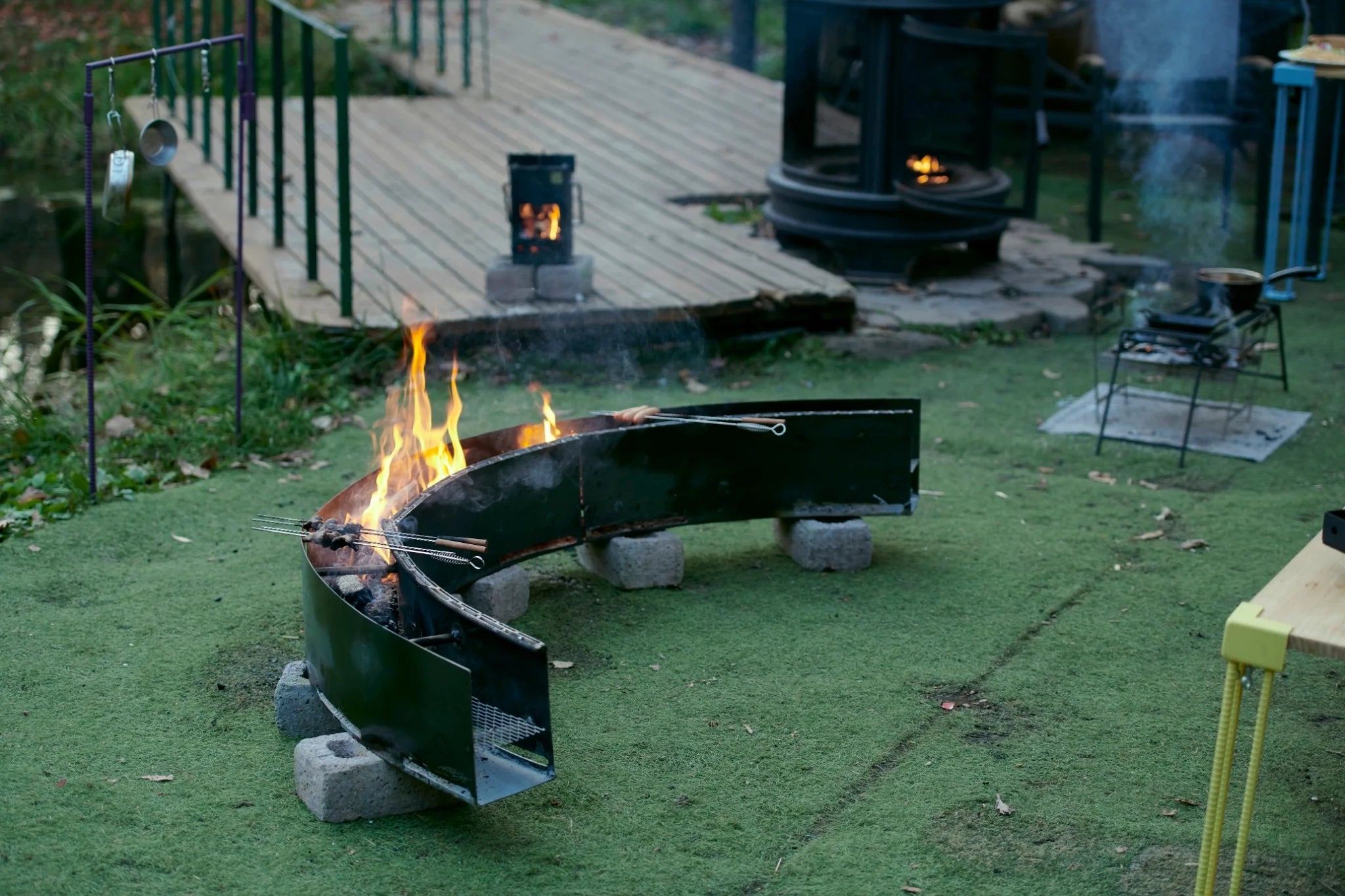 この焚き火台のもう一つの魅力は、その頑丈さと安定感です。鉄製でしっかりとした構造を持つため、風の強い日でも倒れる心配がなく、安全に使用できます。さらに、ラウンド型の形状は荷重を分散し、重い鍋を乗せても安定して調理ができるため、キャンプ料理の幅が広がります。