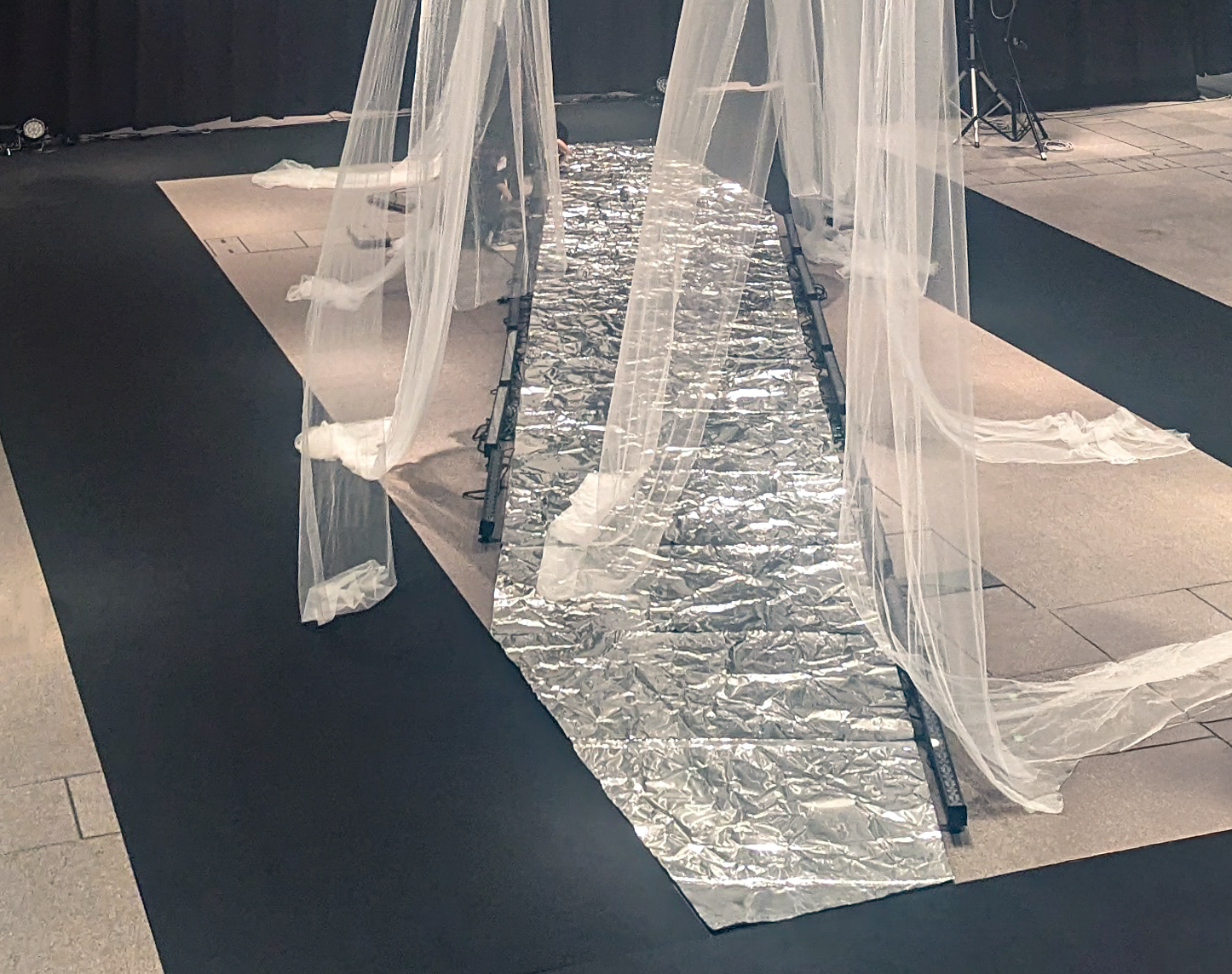 様々な色を反射するよう、不規則な凹凸をアルミ板に加工を施し、配置しました。全長は約10mです。アルミ板の下にはゴム板を敷き、ズレ止めの対策もしっかりとしています。