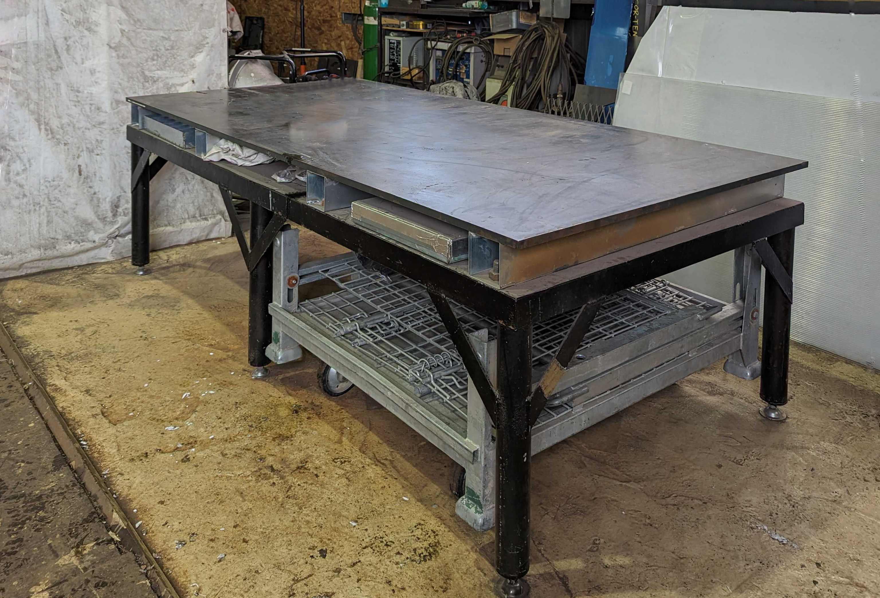 黒皮の鋼板で表面が覆われており、溶接も研磨もできる、鉄工所ならではの作業台です。